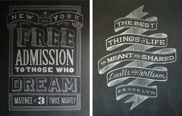 I’m starting out the week completely amazed and inspired by the work of Dana Tanamachi, a custom chalk letterer and graphic designer. In this digital age, the drawing of letters is almost a lost art. But, I love the gritty and personal quality of these large-scale pieces. I love the whimsy inherent in conveying a message in the chalk medium. I also love the idea of possibly moving our digital tools in reverse — scoping out designs and messages in the digital sphere, and THEN translating that message back to a hand-wrought medium like chalk. [I think I may be gushing.] Be sure to check out the time-lapse video Dana made of the process of creating one of her pieces.