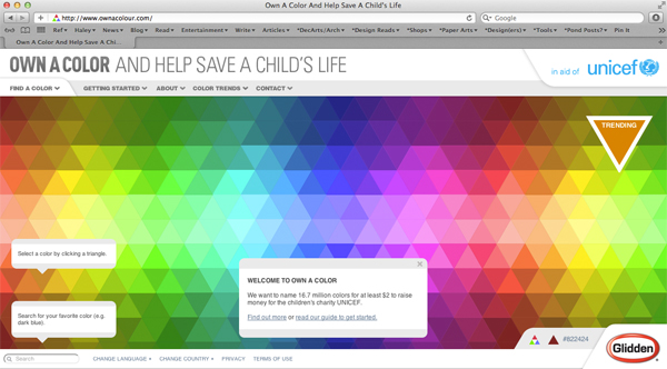 I love this idea! I came across ownacolour.com in a recent ezine and was really impressed by the clever approach to fundraising. The site is developed through the support of Glidden paints and benefits Unicef, the United Nations’ children’s fund. For a donation through the site of as little as $2, you can purchase your choice of the 16.7 million available colors. You can name your color, make a statement about why you like the color and give it a one-word description. You can even gift the color to someone if desired. For you web techies out there, your donation also gets you the hex code for your newly named color of choice for use later.