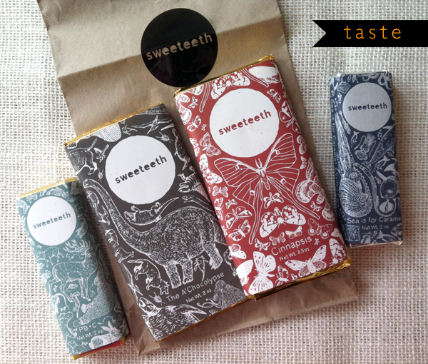 Holy Wow, was I wrong in the “just chocolate bars” department! I learned about Sweeteeth, the Charleston confectioner shop that made these goodies in an article on Southern chocolatiers in Garden & Gun magazine. Now, I AM a pretty avid chocolate lover, so I decided I would give myself the little assignment of taste-testing all the featured shops in the article (good idea, huh?). The illustrations on the Sweeteeth bars convinced the designer in me that these should be first on my list.