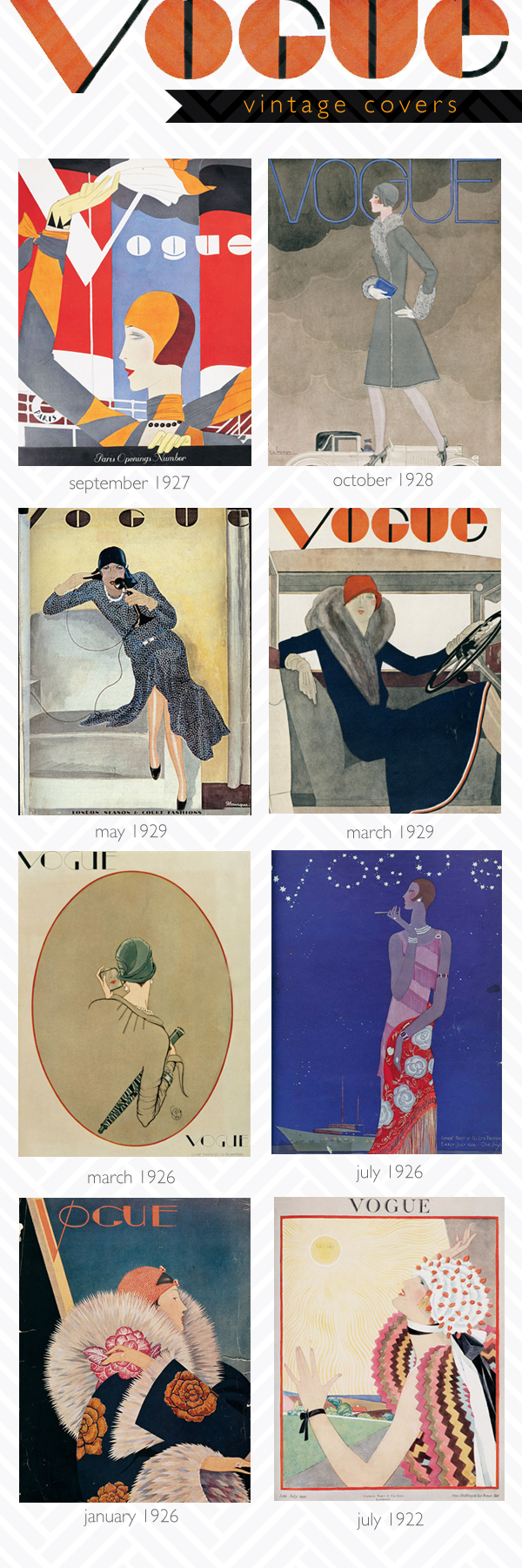 Recently, I stumbled across the online Vogue UK Cover Archive, and I was excited to find a showcase of cover art dating all the way back to 1916. While it was fun to see some of the styles of past decades documented in the cover photos, the real treasure for me was the older illustrated covers. The evolving illustration styles, innovative compositions and “Vogue” typefaces were an inspiring tour of fashion history and design. The archive includes information about the various issues as well as the illustrators.