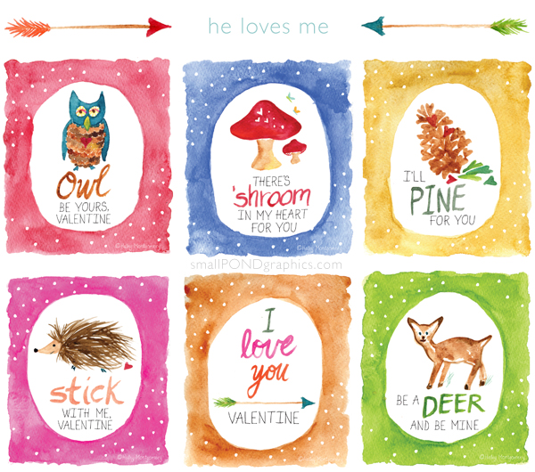 I know Valentines Day may make some of you roll your eyes, so I had a little fun with watercolors creating these printable sentiments to appeal to both the loved and the love-lorn. The woodland-inspired set above are for those in the “he loves me” category. AAAND, for those in the “he loves me NOT” group, you’ll find the alternate set below.