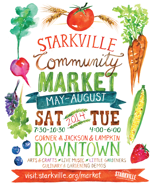 We’re getting into farmer’s market season, and I’ve been very excited to work with Starkville Main Street to produce graphics and this poster for the Starkville Community Market. It was particularly fun this year because we decided to use watercolor imagery. I was able to do some hand-painted lettering and watercolor sketches of produce to use for the pieces. If you’re in the Starkville area, I hope you’ll stop by opening day for the Market this Saturday. I know it will be fun! Meanwhile, I thought I would share a few of the process illustrations for this year’s graphics. I started with a quick mock-up pencil sketch for the arrangement of the poster before painting various sketches of fruits and vegetables. For the lettering, I began with light pencil guides and very sketchy graphite letter structures on the largest elements and mostly freehand strokes on the other words. Through the wonder of Photoshop, I’ve been able to use the paintings in different variations and arrangements.