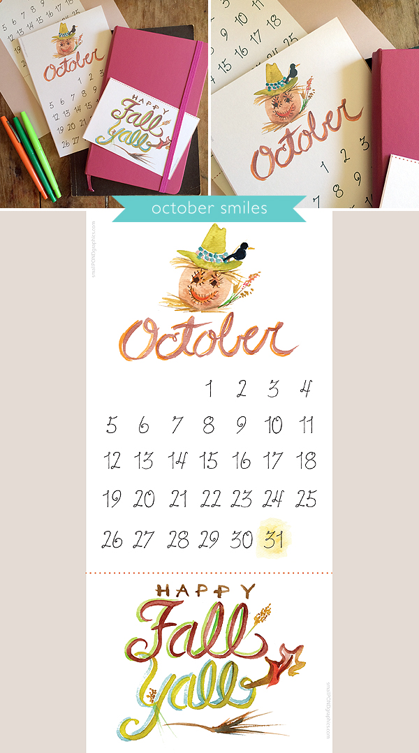 October is here! It’s my favorite month of the year — probably because it hosts my birthday along with all the other fun Fall traditions we love to enjoy! Around the first of October each year, we traipse up the attic ladder to retrieve the boxes of fall decorations. They are filled with various pumpkin-themed artwork from my kids, vintage Halloween happies and jack-o-lanterns from when I was young and things we’ve bought along the way. We don’t go in for spooky around here, but we all look forward to filling our house with ways to celebrate the changing season. We’re saving the front porch scarecrows for this weekend, but I thought I would share a few glimpses of our October happiness. Plus, I’m excited to share a little scarecrow smile in this month’s printable calendar. Download it here or click the image below, and print yours! As usual, it includes a little painted sentiment at the bottom to share when the month is done. Happy Fall, Y’all!