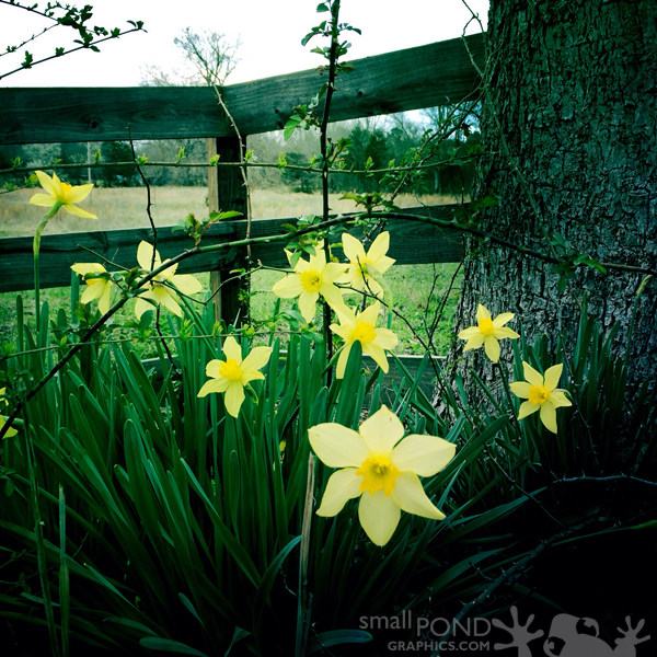 Our farm house has a collection of daffodil bulbs that bloom each year along the fencerow. It’s behind the house and separates the “yard” from the front pasture, and my grandmother planted them sometime when my mom was a child. There are also a row of them that usually sprout up in a line out in the side pasture marking the place where an old fence once stood. And then, randomly with almost inexplicable origins, there are some that tend to crop up across the road, next to ditches, and various other odd places around the yard. I’m not convinced on whether my grandmother planted those, or if they arrived by pure magic! These daffodils are ones we look forward to seeing when we make what’s become the annual spring break trek to the farm in search of carefree days (and muddy play, like this year).