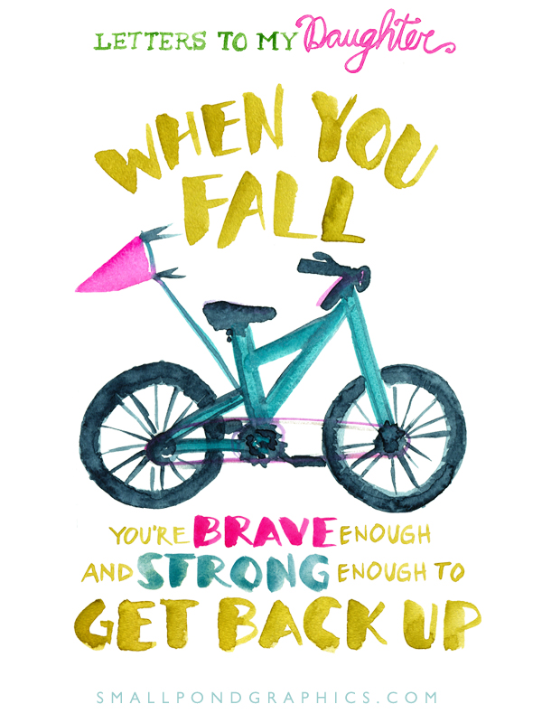 These days, Baby Girl (all three, really) will topple over something or plow through something and hit the floor, and it doesn’t take much to help her pop back up again ready for more play. I love her “full speed ahead” mindset and her tendency to take the big leap. But, I also know that as she gets older and discovers more of life, some falls won’t be as easy to get up from. Some of the wounds from those falls will be deeper than the tears she shed over a bicycle collision. Some will shake her and bruise her in the depth of her heart. I hope she keeps on taking the leaps. In spite of the falls. I hope she is always willing to plunge in, to speed into the challenges. And, I want her to know that I KNOW… she IS brave enough. She IS strong enough. She CAN get back up. And start again.