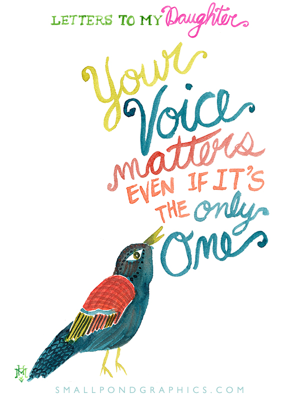 Something I’m trying to learn myself. It’s comfortable to be part of a chorus. We like to belong and to be part of something big and loud. But, I want Baby Girl to know that her voice and her thoughts and her passions (when she figures them out) are strong and powerful even if she’s speaking them alone. Even if she’s singing to the wind or to speaking to the sound of only crickets, her voice matters.