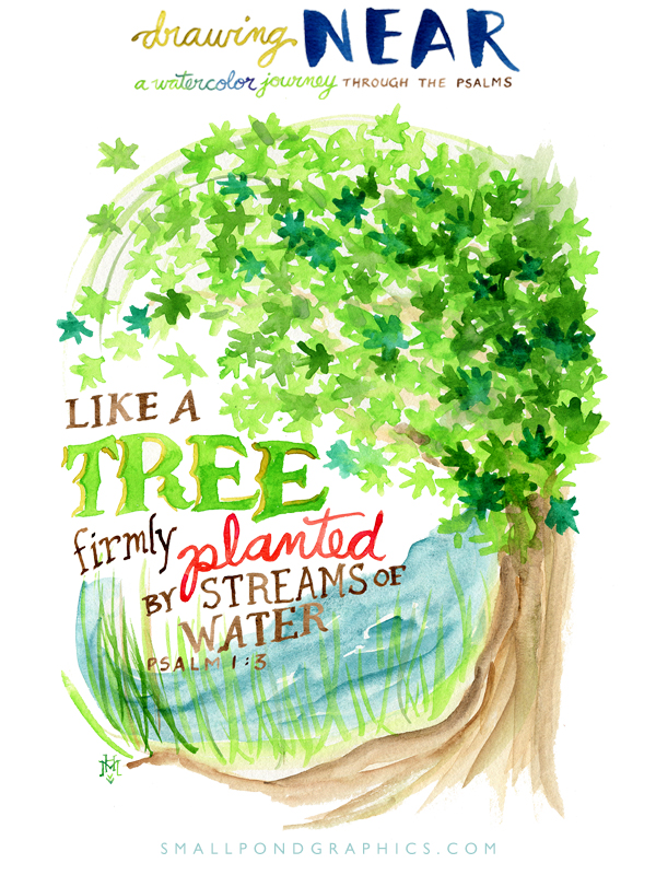 So, I’m beginning a new painting and lettering journey. A series that lets me explore those thoughts and “draw near” through the book of Psalms. Because I so often process my thinking by writing and painting, I hope to use watercolor as a way to slow my thoughts and record them and the lessons I learn in a more meaningful and memorable way. I know this series will not be a daily one. I don’t want to create pressure for myself with another daily painting commitment, but I plan to start with Psalm 1 and move through at a pace that lets me absorb something new (or familiar) about God in each chapter. I will be sharing the painted journey along with some of my journaling here on the Frog Kisser blog and also on my Facebook page, so I hope you’ll follow along. I don’t do this to hold myself up as any strong example of Biblical wisdom or Christian faith — only as fellow journeyman in need of the Mighty One. I hope you’ll be encouraged by what you see.